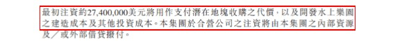 当时,卡森公告称水上乐园合营公司将以1.13亿元人民币(1,640万美元)向其少数股东林女士(柬埔寨公民)收购一块面积为154,886平方米的地块。