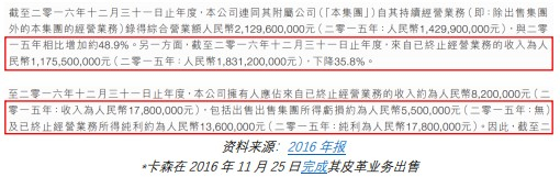 然而,在2016年年报中,卡森称债务豁免增加至2.448亿元人民币,莫名地比之前披露数多了8000万人民币。因此,董事长女儿们所需支付的现金对价从人民币3.25亿减少到2.48亿。这8000万人民币对卡森来说并不是小数字,卡森在2016年的税前利润仅为600万元人民币。