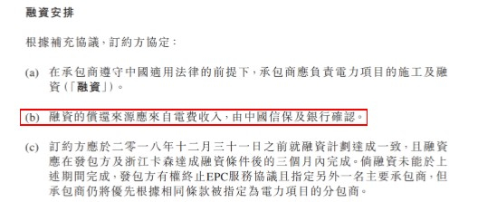 我们不得而知。据卡森称,其柬埔寨合营公司仅为该项目提供某种“过桥贷款”。公司公告的 EPC合同模糊地 披露,卡森将为中国能建的施工支付“预付款”,当中国能建从该项目的贷款银行取得融资时将其返还。
