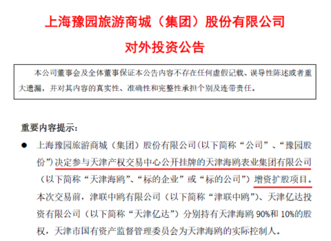豫园股份此次参与天津海鸥增资扩股项目,将由旗下全资子公司上海汉辰表业集团持有海鸥表业65%股权,成为天津海鸥表业的控股股东。