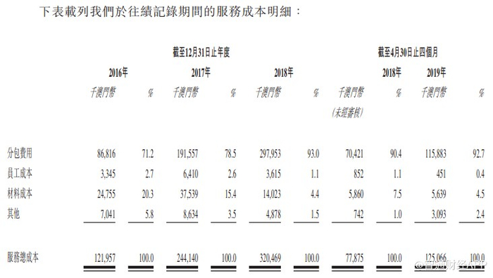 华记环球集团最大的成本是分包费用,占总服务成本的70%以上,从2018年开始占比超过90%,这一成本主要是支付给分包商开展工程的成本,通常包括分包商雇员的工资及分包商的材料及设备的采购成本。其盈利能力极度依赖控制及管理分包费用的能力。