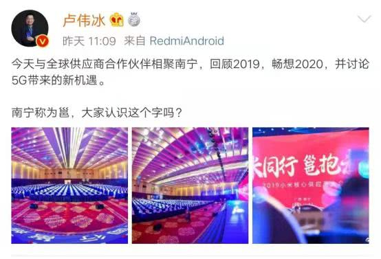 Redmi产品负责人卢伟冰发微博表示,今天与全球供应商合作伙伴相聚南宁,回顾2019,畅想2020,并讨论5G带来的新机遇。