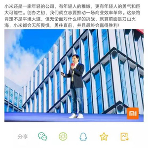 小米还是一家年轻的公司,有年轻人的稚嫩,更有年轻人的勇气和巨大可能性。创办之初,我们就立志要推动一场商业效率革命。这条路肯定不是平坦大道,但无论面对什么样的挑战,就算前面是刀山火海,小米都会无所畏惧,勇往直前,并且最终会赢得胜利!