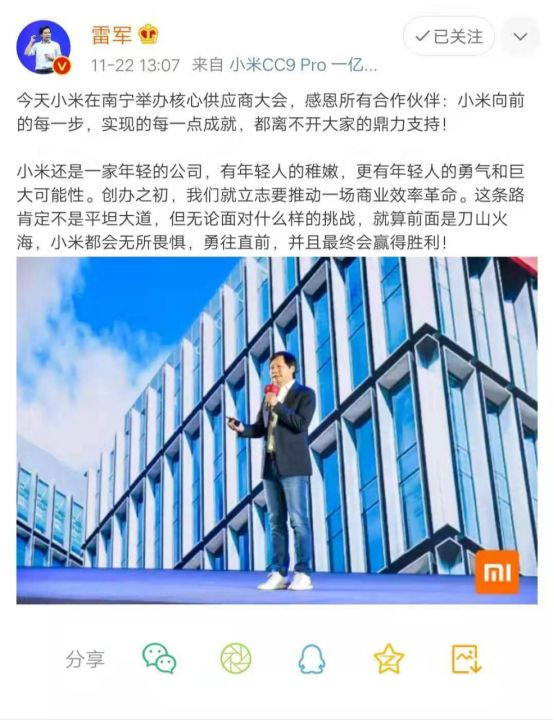 雷军在微博表示:今天小米在南宁举办核心供应商大会,感恩所有合作伙伴:小米向前的每一步,实现的每一点成就,都离不开大家的鼎力支持!