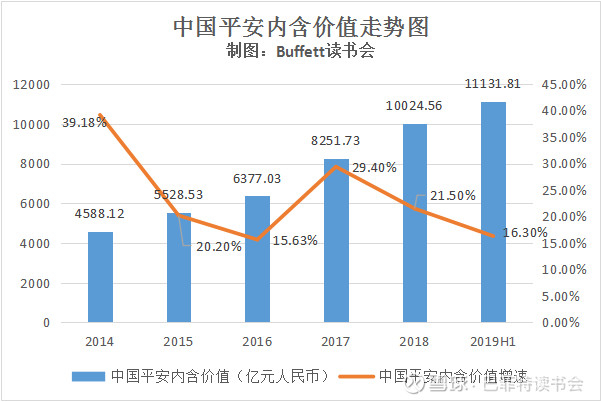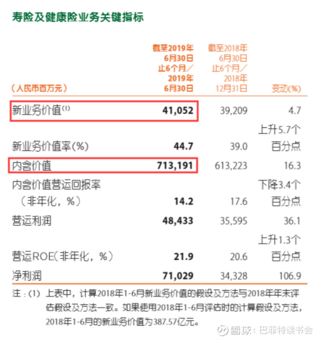 新业务价值则是增量保单业务的价值,一般会给当年的新业务价值一个乘数,以预估未来新业务价值的持续价值,参考普通公司的PE。平安2019H1寿险及健康险新业务价值为410.52亿元,同比增长5.7%。
