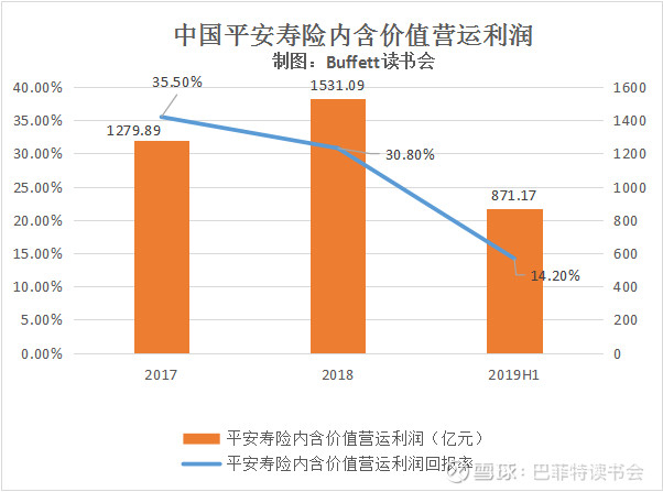 平安2019H1内含价值营运利润14.2%,按年化28.4%,和去年相比稳中有降。