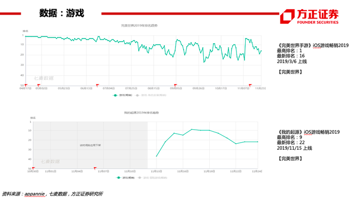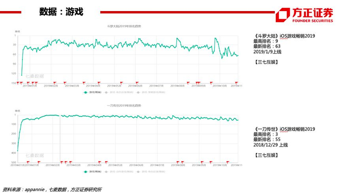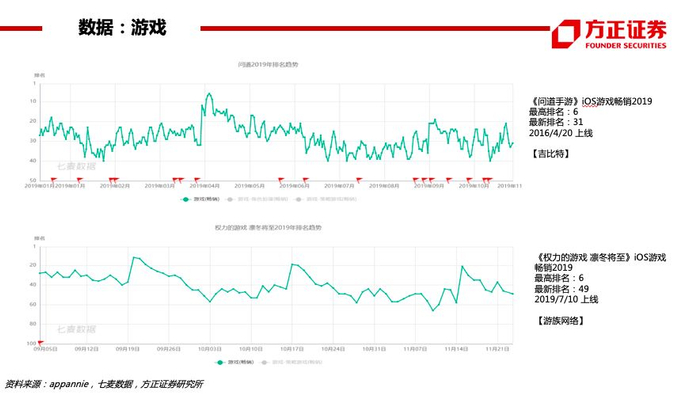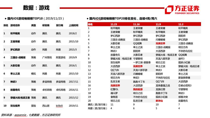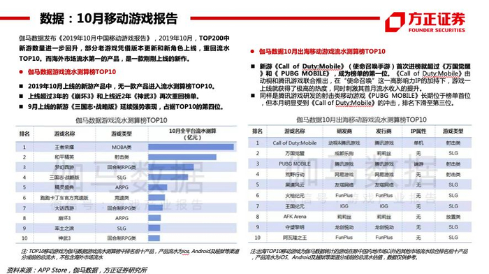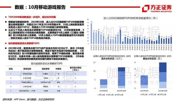 数据(伽马10月移动游戏报告):《王者荣耀》《和平精英》《梦幻西游》《三国志·战略版》《精灵盛典》位居流水TOP5。19年10月进入过iOS日畅销榜TOP200的新游数量23款(超过17-18年的16/14款)。新游流水TOP5的产品流水均在5亿元以下,其中放置类新游《不休的乌拉拉》位居第1、首月超3亿元。