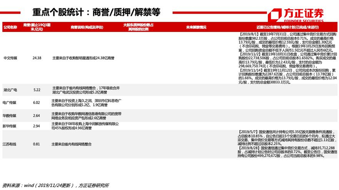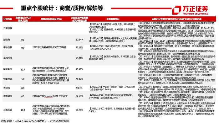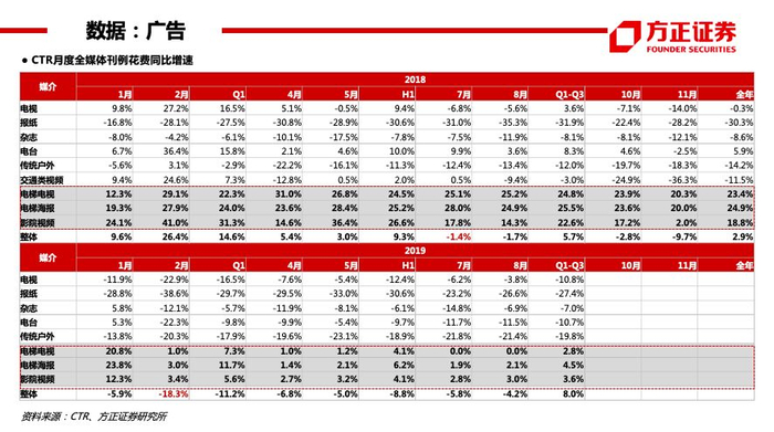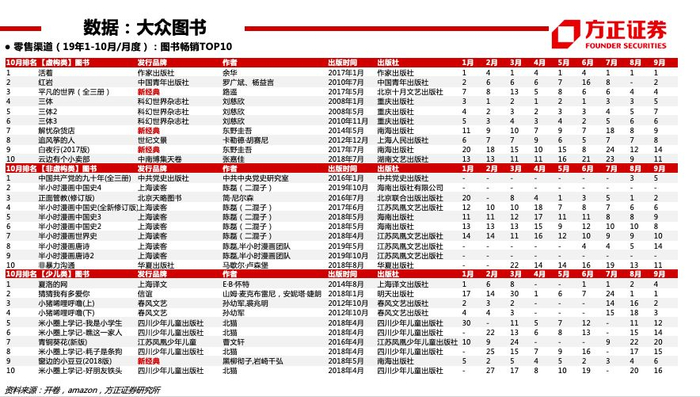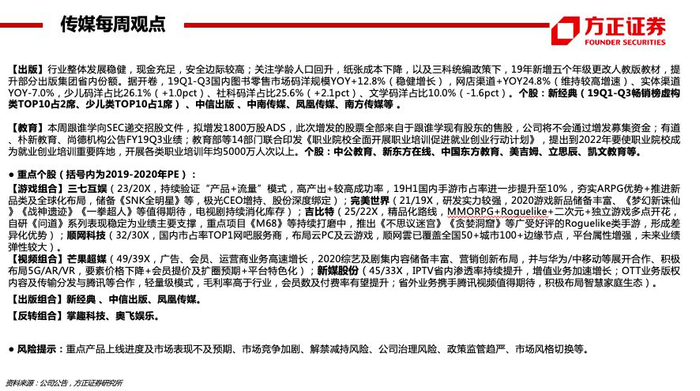 【出版】行业整体发展稳健,现金充足,安全边际较高;关注学龄人口回升,纸张成本下降,以及三科统编政策下,19年新增五个年级更改人教版教材,提升部分出版集团省内份额。据开卷,19Q1-Q3国内图书零售市场码洋规模YOY+12.8%(稳健增长),网店渠道+YOY24.8%(维持较高增速)、实体渠道YOY-7.0%,少儿码洋占比26.1%(+1.0pct)、社科码洋占比25.6%(+2.1pct)、文学码洋占比10.0%(-1.6pct)。个股:新经典(19Q1-Q3畅销榜虚构类TOP10占2席、少儿类TOP10占1席) 、中信出版 、中南传媒、凤凰传媒、南方传媒等 。