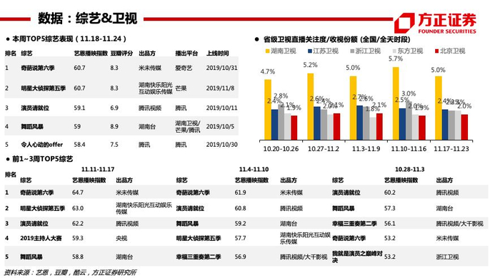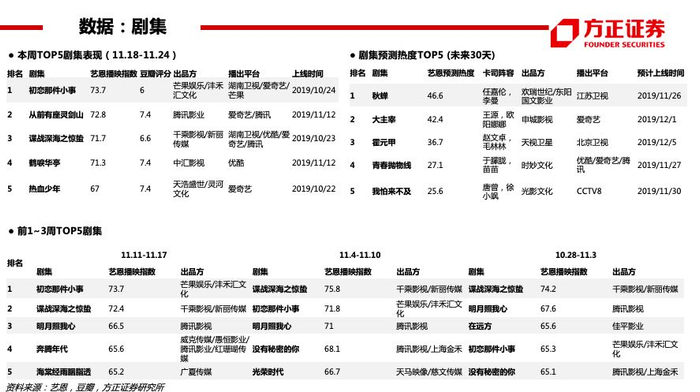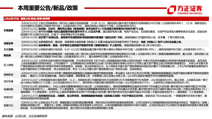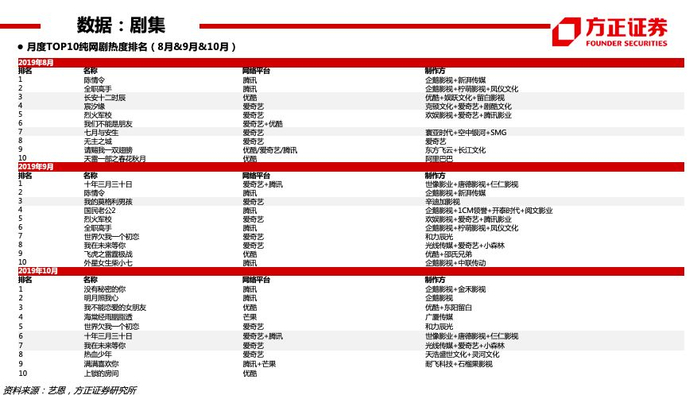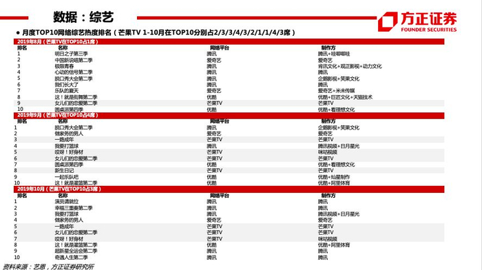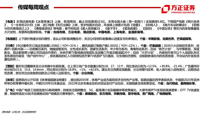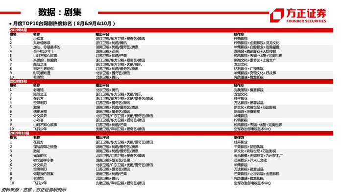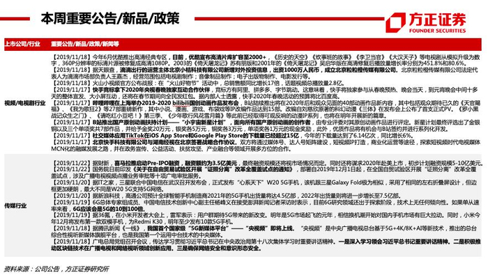 【付费】19Q3爱奇艺订阅会员规模1.058亿(YOY+31%),腾讯视频订购账户数1.002亿(YOY+22%)。个股:芒果超媒(2020六大自制综艺系列,经典IP+创新内容——治愈解压系列、烧脑益智系列、女性成长系列、居家生活系列、年少有为系列、青春热血系列;启动“新芒计划”,与华策影视、深蓝影业、观达影视等14家公司完成合作签约,未来芒果TV影视剧自制团队及战略工作室总数或超20个;启动“大芒计划”,内容创作者可以个人或团队形式发布原创内容至“用户创作中心”,排名靠前的红人可获得包括芒果TV优质IP飞行嘉宾、衍生微综艺授权、自制剧参演在内的优质资源,平台站内外宣发流量包扶持)。