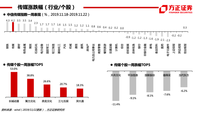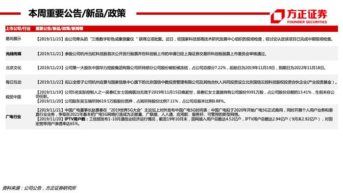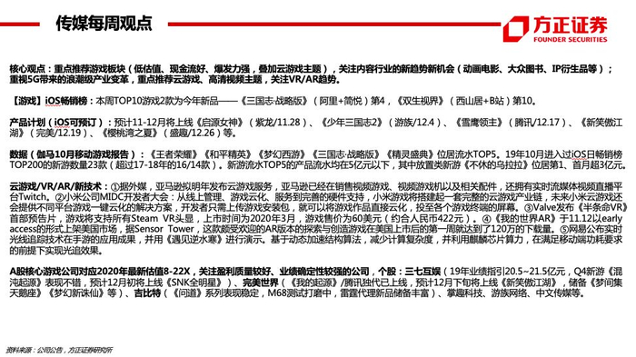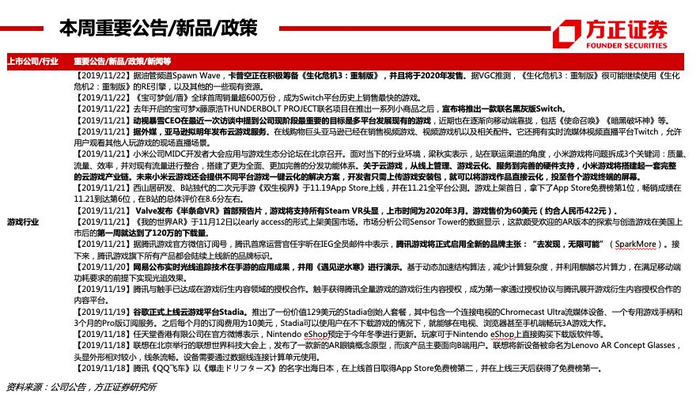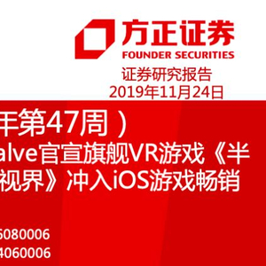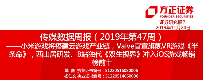 方正传媒46页数据周报·19年第47周·小米游戏将搭建云游戏产业链,Valve官宣旗舰VR游戏《半条命》