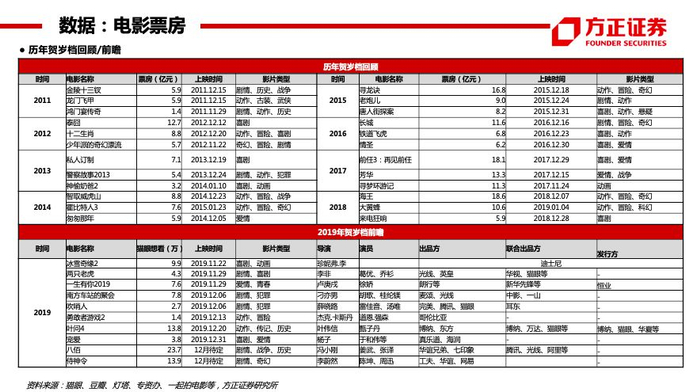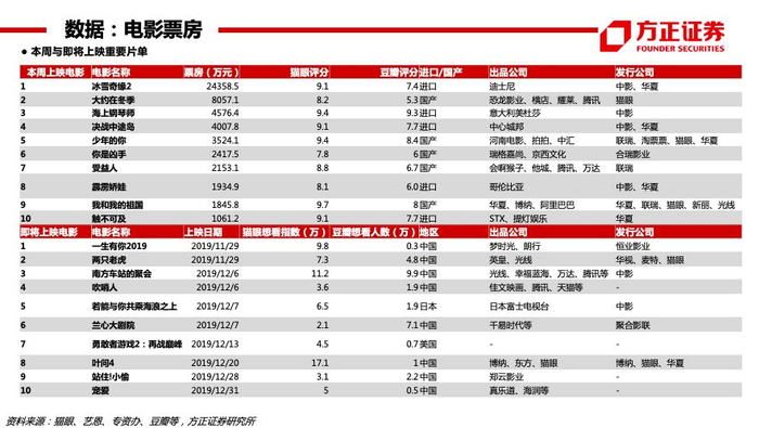 【电影】本周动画电影《冰雪奇缘2》上映,取得周冠,截止目前票房过3亿。本周全国大盘(周一到周六)实现票房5.8亿。下周国产电影《两只老虎》、《一生有你2019》上映,进口电影《利刃出鞘》上映,贺岁档逐步启动,年底将上映影片包括《宠爱》、《吹哨人》、《南方车站的聚会》、《若能与你共乘海浪之上》、《勇敢者游戏》等电影;春节档包括《唐人街探案3》、《姜子牙》、《紧急救援》、《囧妈》、《中国女排》等在内的多部重量级大片定档,有望再创票房新高。个股:光线传媒、万达电影、横店影视、中国电影、上海电影、金逸影视等。