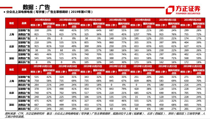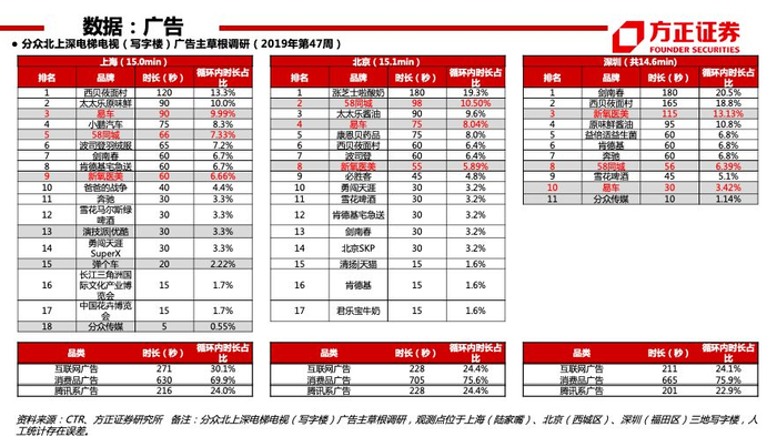 【营销】看好生活圈媒体及分众传媒中长期发展。北上深三地广告主数量分别为18、17、11个,同比变动分别为+12.5%、+30.8%、-21.4%;广告循环时长分别为15.0、15.6、14.6min,同比变化分别为-18.8%、+1%、+62.6%。建议关注消费宏观数据、分众传媒刊挂率、收入端与收入结构变化,近期流动性改善,密切关注应收账款回款及公司收入边际变化。个股:分众传媒。