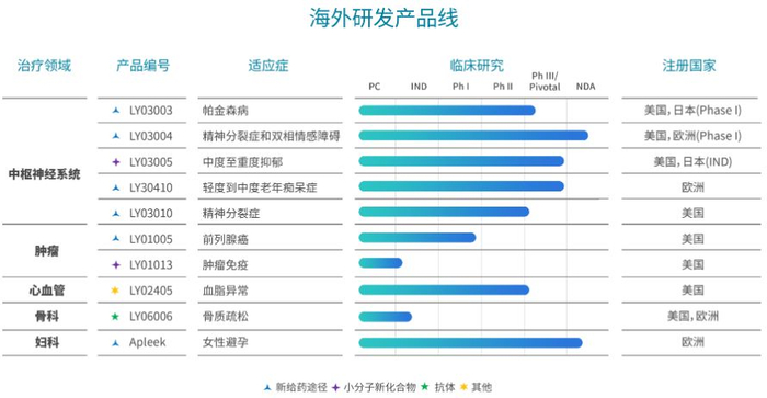 LY03004用于治疗精神分裂症和双相情感障碍I型,以肌肉注射的方式每两周给药一次。此前,LY03004已在中国完成了40例的单次给药爬坡人体药代动力学及安全性试验和100例的人体生物利用度比对试验,临床结果显示,LY03004可以改善口服抗精神病药物在精神分裂症患者中普遍存在的用药依从性,并将简化精神分裂症的疗程。此外,与另一种市售药物相比,LY03004拥有多项优势,例如患者接受LY03004首次注射后只需服用更短的口服制剂,而且比该市售药物能更快地达到稳态血药浓度。