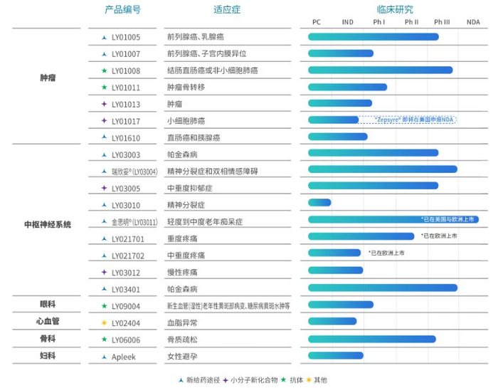 在国内的产品线共有在研项目41个,其中肿瘤药物16个,中枢神经药物15个。