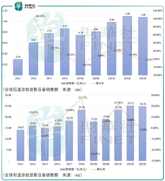 从技术难度上来说,集成电路前道设备的应用难度肯定大于后道设备的应用难度,这一点从全球后道涂胶显影设备与全球前道涂胶显影设备的市场规模对比来看可以证明: