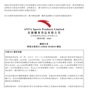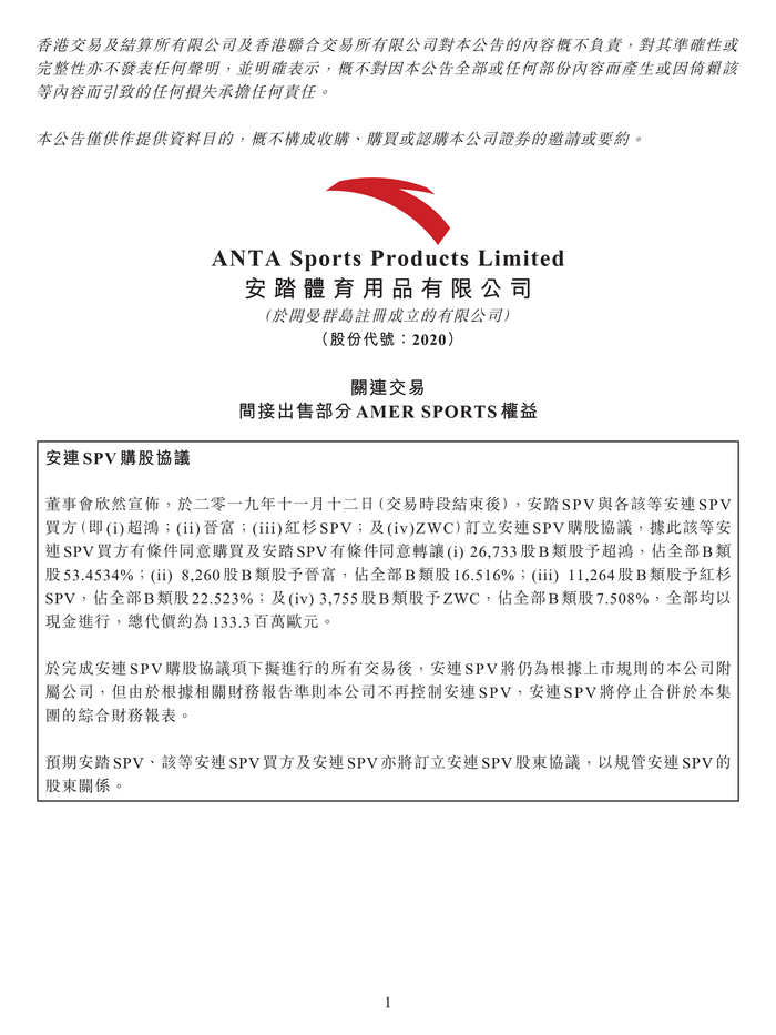 一个多星期前,11月12日晚间,安踏还曾发布公告称,以11.98亿港元(约人民币10.74亿元)出售Amer Sports(亚玛芬)间接权益的5.2517%。