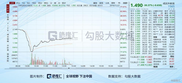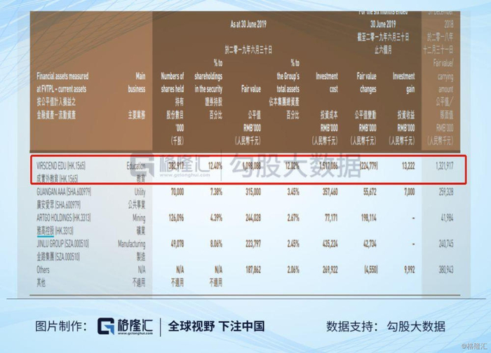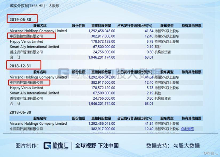 注意了,就是2016年开始的这一波“转型教育”的过程中,投了几家内地的民营教育公司,其中便包括今天早晨一起暴跌的成实外教育。Wind显示,截至2019年6月30日,首控是成实外教育的第二大股东。