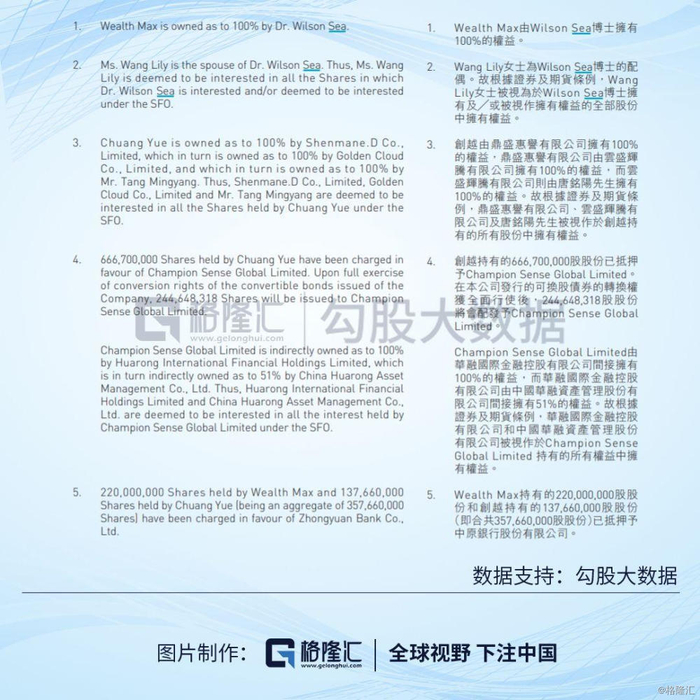 从首控中报中看到,公司有6.67亿股的股份质押给华融的子公司Champion Sense Global Limited;有3.58亿股质押给中原银行股份有限公司。质押盘占总股本接近五分之一。