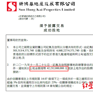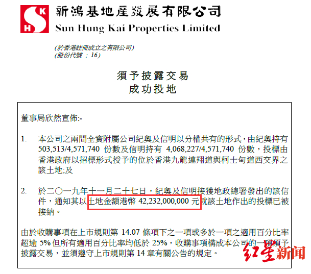 香港最大地产商之一新鸿基地产发展有限公司(00016.HK)最新批露,公司两家全资附属公司纪奥有限公司、信明(香港)有限公司,于11月27日竞得位于香港九龙连翔道与柯士甸道西交界土地,中标价为422.32亿港元,批租期为50年。