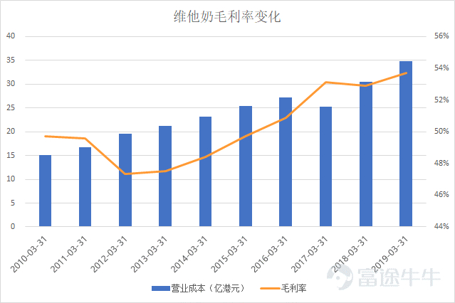 为了进一步定位维他奶净利率波动的原因,继续来看毛利率和经营利润率的变化。与净利率走势不同,维他奶国际的毛利率从2011财年开始逐年上涨,可以推测随着规模扩张和生产线升级,产品的生产成本得到了明显的控制。