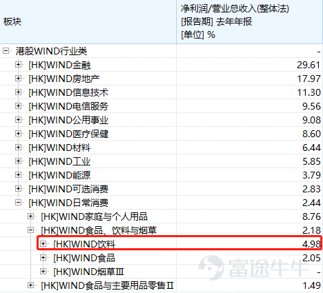 纵向对比反映的是时间维度上规模的增长,而横向对比则有助于找到维他奶在同行业中的地位(如下图)。维他奶的规模在港股食品饮料板块不算太大,排在第11位。
