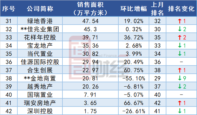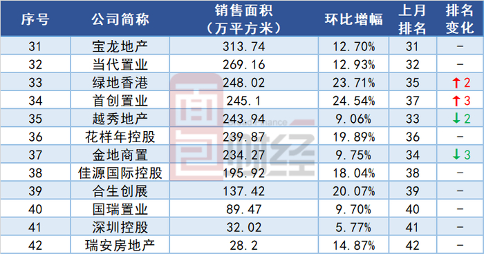 单月销售面积TOP30:13家上升,10家下降