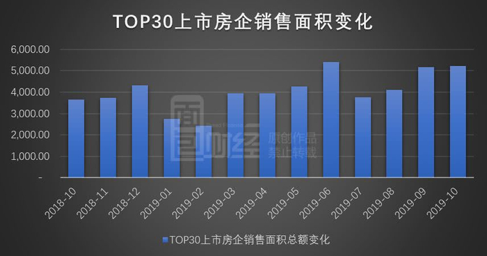 截止2019年10月末,销售面积TOP30的上市房企合计实现销售面积5230.91万平方米,较上月增加70.76万平方米,环比增幅1.37%。