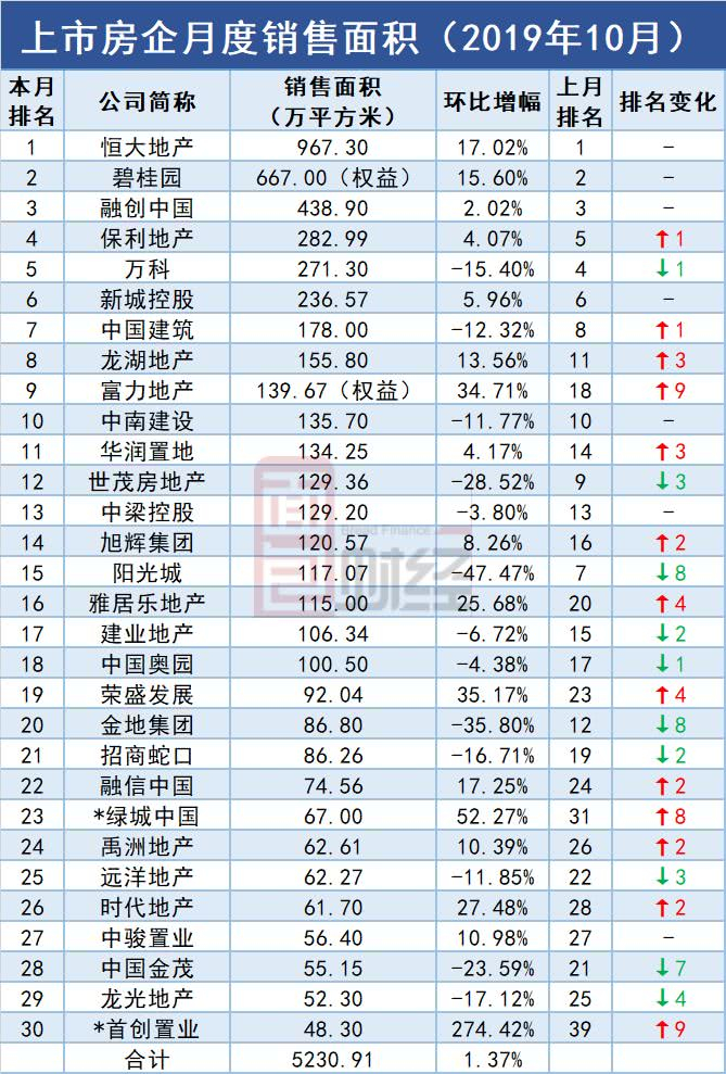 原标题:TOP30上市房企10月销售面积排行:万科滑出前四名