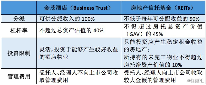金茂酒店属于商业信托(Business Trust),与房地产信托基金(REITs)相比, 两者在分派比例、杠杆率、投资内容、管理费用、权益与投资期限上均存在一些差异,具体如下图表: