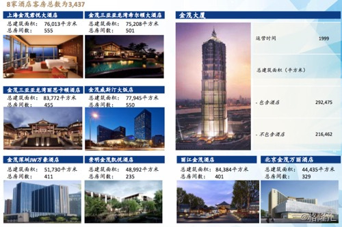 金茂酒店旗下的8家酒店分别为上海金茂君悦大酒店、崇明金茂凯悦酒店、金茂北京威斯汀大饭店、北京金茂万丽酒店、金茂三亚亚龙湾丽思卡尔顿酒店、金茂三亚亚龙湾希尔顿大酒店、金茂深圳JW万豪酒店及丽江金茂酒店,均是优质的高端资产,客房总数为3437间。