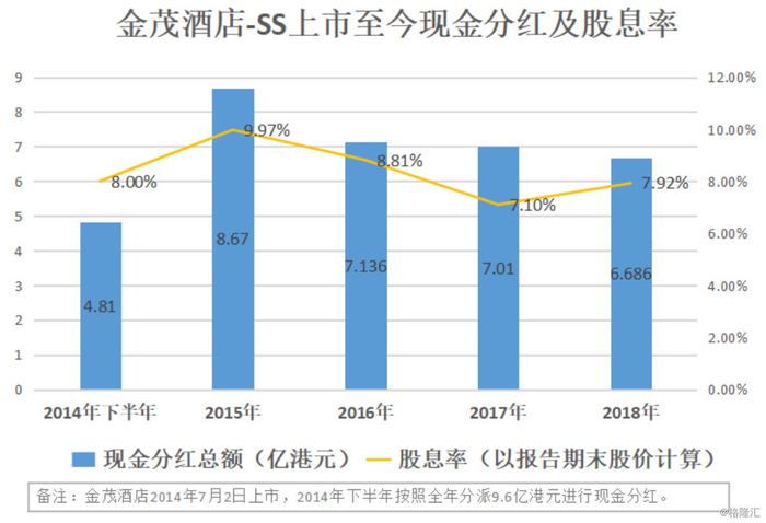 根据万得数据显示,金茂酒店上市之后累计现金分红已达37.63亿港元。2019年上半年金茂酒店的合计可分派收入为2.87亿元人民币,即3.32亿港元,按8月7日4.19港元/股收盘价计算,年分派率达到7.9%,明显高于行业平均水平。