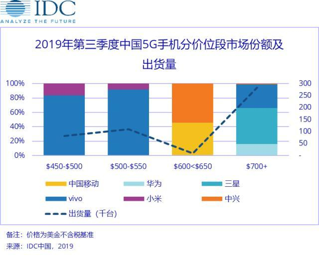 在消费端,首批5G终端市场竞争性布局已现。IDC发布的2019年Q3中国5G手机出货量报告显示,截至2019年9月,国内5G手机整体出货量为48.5万部,vivo凭借率先发力占到了54.5%;而在450-550美元的中高端价位,vivo和小米占据绝对优势,而700美元以上的高端价位被三星、vivo和华为的5G手机瓜分。