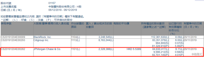 格隆汇获悉,根据港交所最新权益披露资料显示,2019年11月29日,中联重科(01157.HK)获JP Morgan Chase & Co.每股均价5.5389港元,增持232.84万股,总价约1289.68万港元。