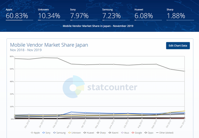 由于运营商掌握了大量的线下渠道,而且对合约通信的费用有优惠,所以消费者们更倾向于购买合约机。除了和运营商合作,进入日本多年的华为也会销售没有合约以及网络锁的手机,即使成为无锁机销量第一,在2018年度也出货不到百万台(据MM综研)。