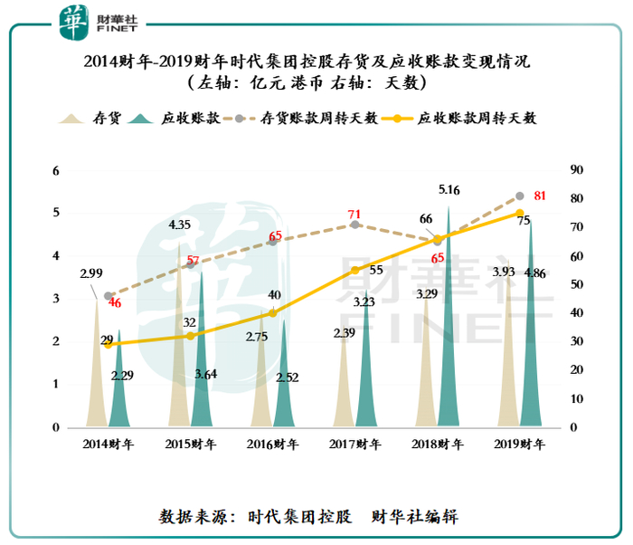 存货方面,截止2014财年-2019财年,存货由2.99亿港元增至3.93亿港元,年复合增长率为5.61%,存货周转天数从46天提升至81天,随着存货增加及周转天数创出新高的影响,2019财年时代集团控股的存货拨备同比增长201%,至4209.5万港元,可见其存货压力之大。
