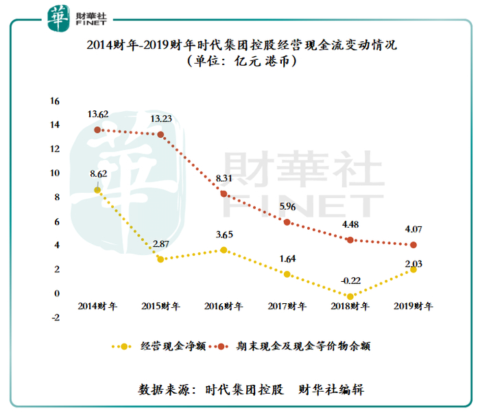 受应收账款及存货的影响,时代集团控股经营现金流呈现出递减的态势。如下图所示,时代集团控股的经营现金流净额及期末现金及现金等价物在2014年的高点开始,现金流入状态并不理想。受现金流吃紧的影响,时代集团控股的2019财年资产负债率提升至21.73%,创出了近8个财年的新高。