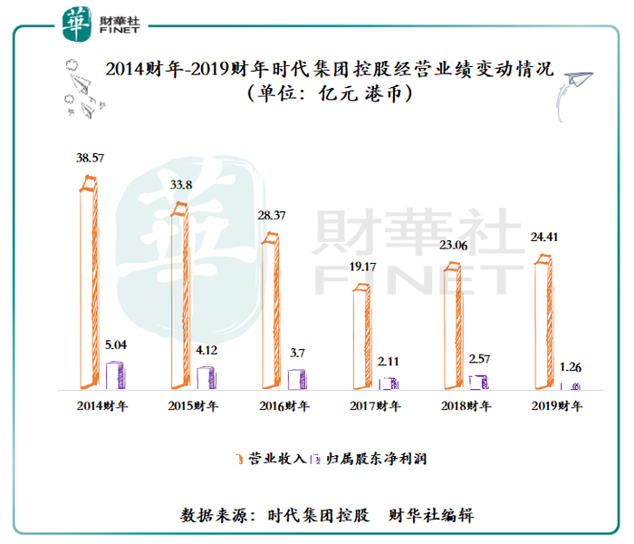 将时代集团控股经营业绩表现拉长至2014年,时代集团控股的业绩的表现可以用惨不忍睹来形容。截止2014财年-2019财年,时代集团控股的营业收入由38.57亿港元下滑至24.41亿港元;归属股东净利润更是从5.04亿港元下滑至1.26亿港元;净利率从13.06%下滑至5.16%。显然,时代集团控股业绩表现并未随着企业拓展而稳步上行,反而呈现出跌跌不休的态势。