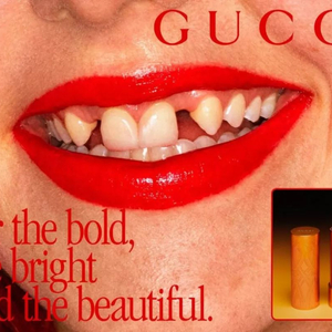 Gucci现任创意总监Alessandro Michele全新操刀的美妆系列一反Gucci以往精致华丽的经典风格,突出多样性与个性化。唇膏系列的广告大片启用了有雀斑、牙齿不齐整的模特,同时放弃了美妆广告以往的精修图,试图传递一种原始包容的自然美。Gucci表示,其美妆系列的理念是化妆并非只为了遮瑕,“不完美”其实是个性化代表,不完美才是最本真的美,而彩妆正是展现自我的方式。