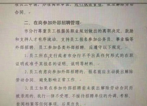 这份建行的内部文件,充斥着管理者的极端愚蠢、自负、官本位思想,一方面,装模作样的“鼓励”员工去参加外部招聘,提升自己,一方面又做了这种“考公先辞职”的要求。