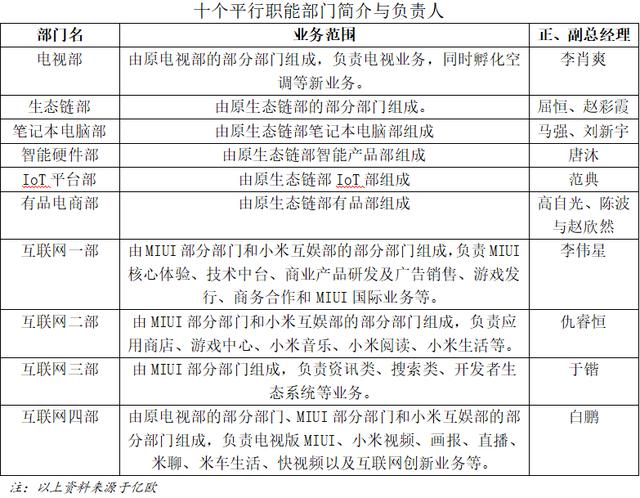 除独立两个组织、决策部门之外,原来四大职能部门:电视部、生态链部、MIUI部和互娱部,也被重新划分为十个新部门,部门经理直接向CEO汇报。