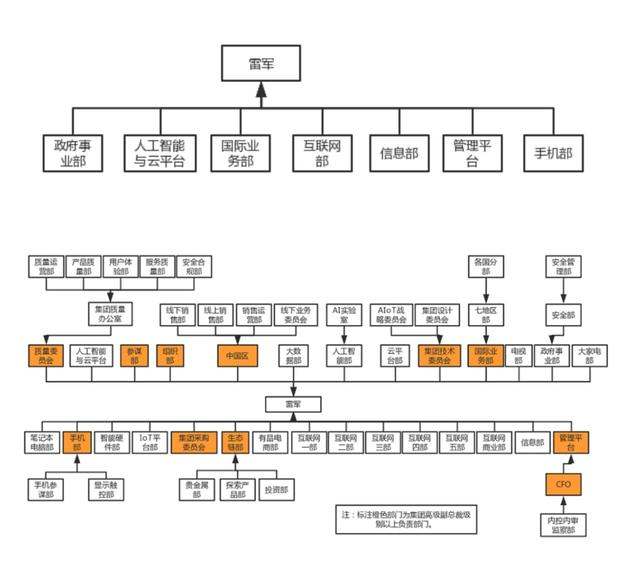 质量委员会、中国区、集团技术委员会、国际业务部、手机部、生态链等六大部门变动最为频繁,率先完成层级化,个别部门还出现三级线性权力结构。