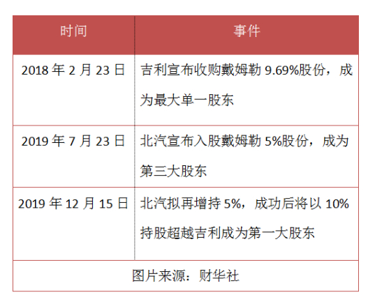 北汽与吉利的这场戴姆勒股权之争始自2018年的大年初九,吉利汽车(00175-HK)宣布从二级市场收购戴姆勒股份公司(Daimler AG)1.036亿普通股,占有表决权股份的9.69%,成为戴姆勒最大的单一股东。