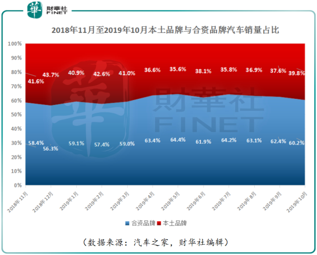 2019年10月,本土品牌汽车实现销量76.8万辆,合资品牌汽车销量116.0万辆,合资品牌汽车销量占总体市场比重高达60.2%。
