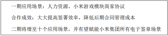 基于对e签宝行业最高的安全资质的认可,小米集团已在人力资源、小米游戏模块商家协议等场景中使用e签宝,随之而来的是签署效率大大提高、后期合同管理成本大大降低。接下来,e签宝还将在十个场景中赋能小米集团,并且有望实现小米全集团全场景的深度合作。