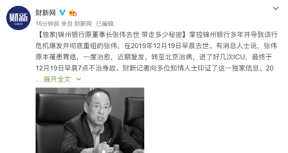 掌控锦州银行多年并导致该行危机爆发并彻底重组的张伟,在2019年12月19日早晨去世。