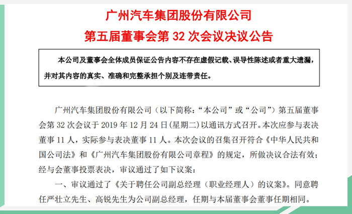 日前,网通社从 广汽集团 (601238,股吧)官方获悉,公司发布董事会第32次会议决议公告,同意聘任严壮立、高锐为公司副总经理,任期与该届董事会董事任期相同。同时,聘任严壮立为公司执行委员会委员。