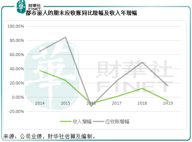 都市丽人的应收账增幅在2016年一度下降后,于2017年再度飙升。截至2019年6月末,该公司的应收账较2018年6月末增加了15.77%,而上半年其收入同比下降5.49%。