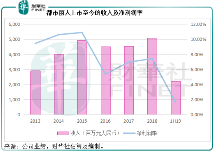 从下图可见,在经历了2016年的收入及盈利能力下跌后,都市丽人的2017年和2018年都有所好转,但是好转的幅度并不明显,只不过刚刚好完成了复星入股时该公司的业绩承诺。