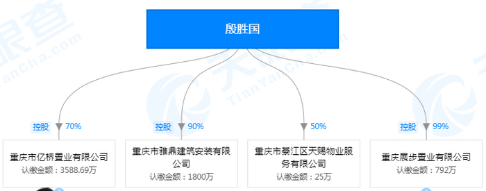 殷胜国旗下除重庆亿桥置业外,还有重庆市雅鼎建筑安装有限公司(注册资本2000万元,持股90%)、重庆市綦江区天赐物业有限公司(注册资本 50万元,持股50%)、重庆展步置业有限公司(注册资本800万元,占99%)。