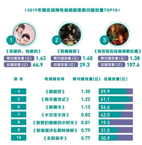 从剧集播放量上看, 2019 年,腾讯电视剧剧集集均播放量最高的是《亲爱的,热爱的》,集均播放量1. 63 亿;其次是《怒晴湘西》,集均播放量1. 40 亿;第三名是《知否知否应是绿肥红瘦》,集均播放量1. 38 亿。《都挺好》《倚天屠龙记》《陈情令》《小女花不弃》《致我们暖暖的小时光》《怒海潜沙&秦岭神树》《全职高手》分别排名4- 10 名。